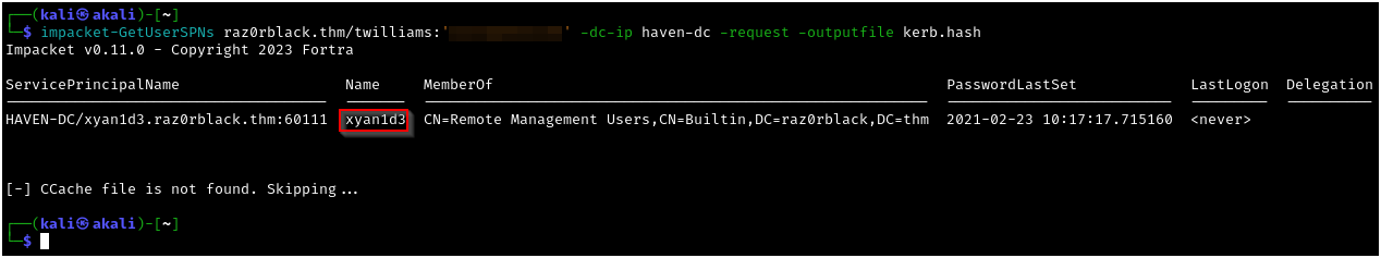 With our newly found credentials, we can query the domain controller for accounts with Service Principal Names (SPNs), and perform a Kerberoasting attack: