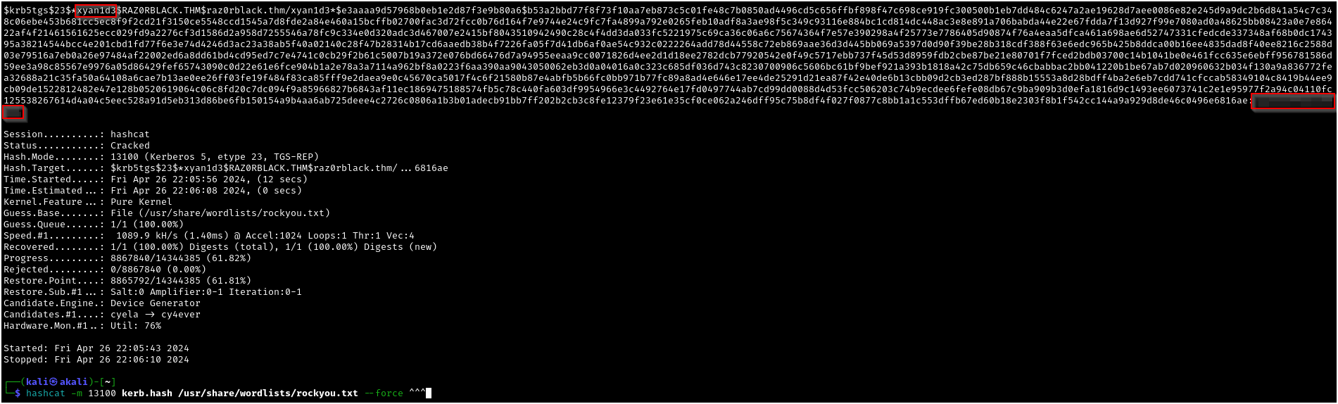 We can again use hashcat with the appropriate mode to crack the hash and gather credentials for this service account: