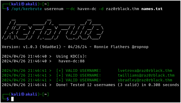 Since we don’t yet have credentials, we can use Kerbrute (https://github.com/ropnop/kerbrute/releases/tag/v1.0.3) to determine which of these usernames are valid: