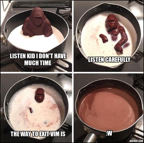 I believe the joke here to be that the chocolate gorilla is dissolving before being able to tell us the full way to exit vim, which is :wq, not :W. We can input the proper method as our answer.