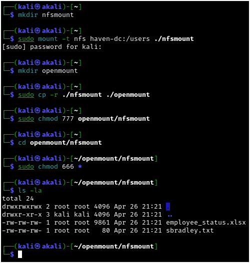 The next step has many moving parts, so I’ll explain them step by step. First, I am making a directory to mount the NFS share in. This share will be mounted with the permissions native to the NFS share, meaning that none of the attacking machine’s users (including root) will have the necessary permissions to manipulate the files. Because of this, we will create a second directory (in this case “openmount”) to house the contents that we will copy from the active NFS mount. After giving full permissions to the new location, we can change directories into the directory, use sudo to give ourselves read and write permissions to the contents, and we will finally be able to interact with the copies of the files we have made from the original NFS share: