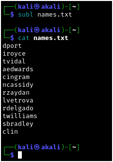 Since we see the user “steven bradley” and we had a file called “sbradley.txt” earlier, we can extrapolate that the username convention is first initial and last name. We can use this naming convention to create a wordlist from the gathered names: