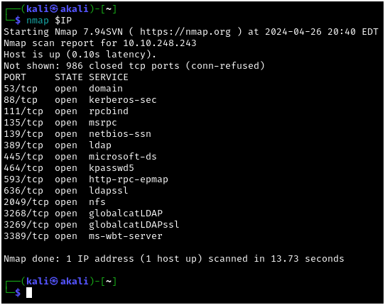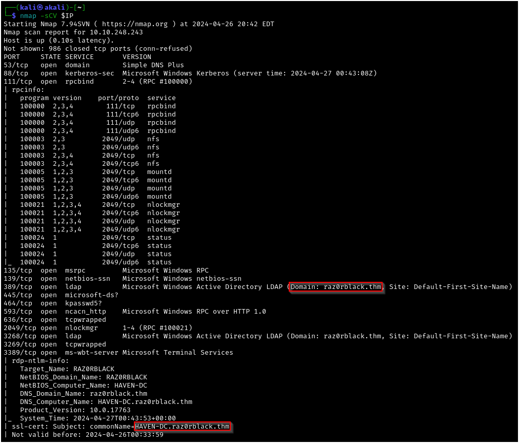 From this output, we can tell what our hostname and domain name are, which helps us answer our first objective. We can add this hostname to our /etc/hosts file since we’ll be interacting with Kerberos later.