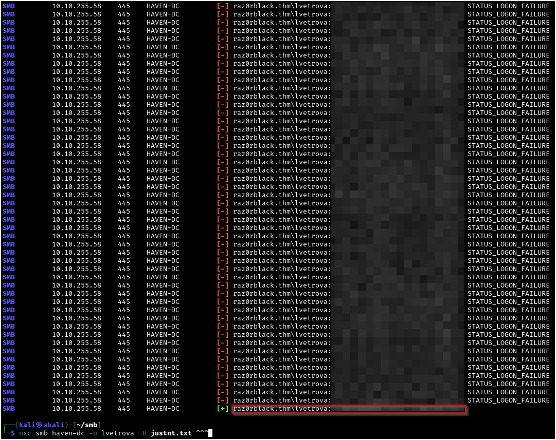 To get access to Ljudmila’s (lvetrova) flag, we’ll first need to get access to the SMB share on the machine. To do this, we can check for password re-use from the credential we found for twilliams through AS-REP roasting: