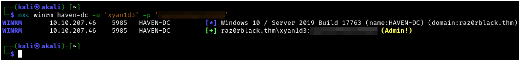 We can use netexec to check what access this new user has. Here we can see that xyan1d3 has WinRM access to the Haven-DC machine (note that the “Admin!” note is not indicative of admin status in the WinRM mode of nxc, and instead just shows that we have WinRM access):