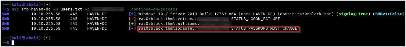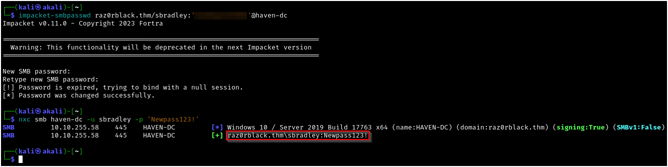 As we can see here, the password for twilliams is a valid password for sbradley, but the password needs to be changed. We can use imacket-smbpasswd to change this user’s password to a new password that we will have access to: