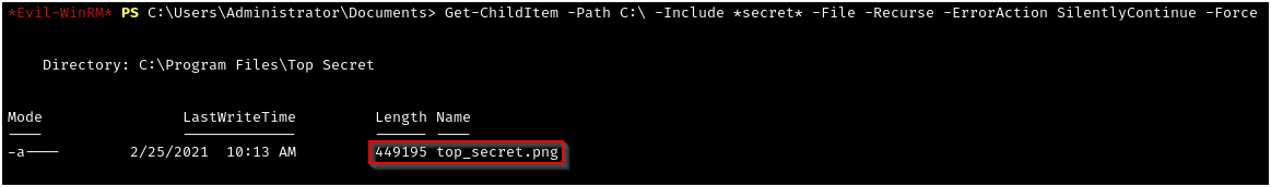 This just relies on manual enumeration. You can use the PowerShell script below for a sure-fire way to locate the file, which I did on a hunch just because of the challenge asking for a “secret.” However, since this script scrubs the entire C:\ drive, it will take quite a long time. Manual enumeration might be faster in this case.