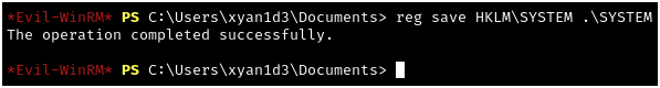 Next, we will need to export the SYSTEM registry hive from HKEY Local Machine and save a copy that we can exfiltrate to our attacking machine: