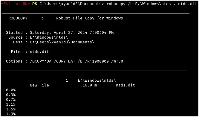 Next we will use robocopy to back up the NTDS.dit file to our current directory: