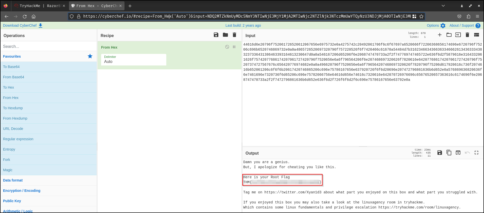 Noting that the “Password” is made up of hexadecimal characters, we can use https://cyberchef.io to decode the string: