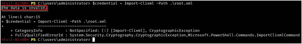 However, when we try to use PowerShell to import the XML file, we get an error message that the data is invalid. This suggests that the data has been modified in some way: