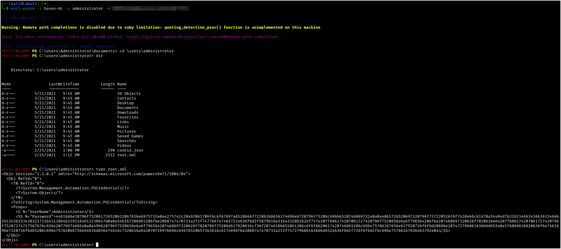 We can log in using the hash we previously extracted for the administrator user and view the PSCredential XML file as before: