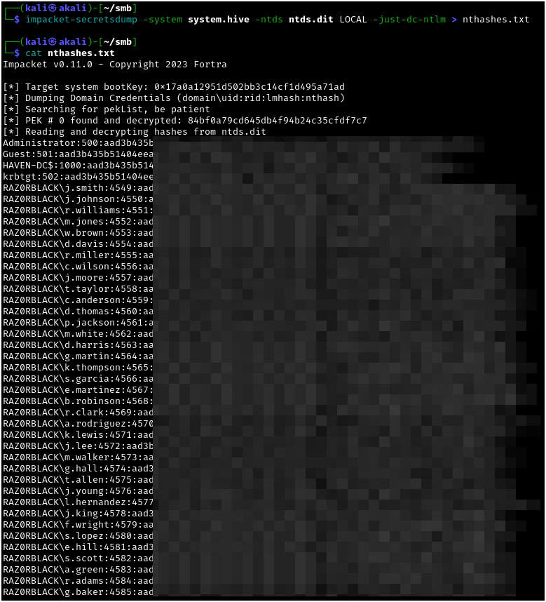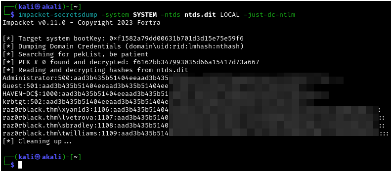 Now we can run impacket-secretsdump on our attacking machine, supplying the SYSTEM key to decrypt the NTDS.dit file, and dump the hashes of all the domain users: