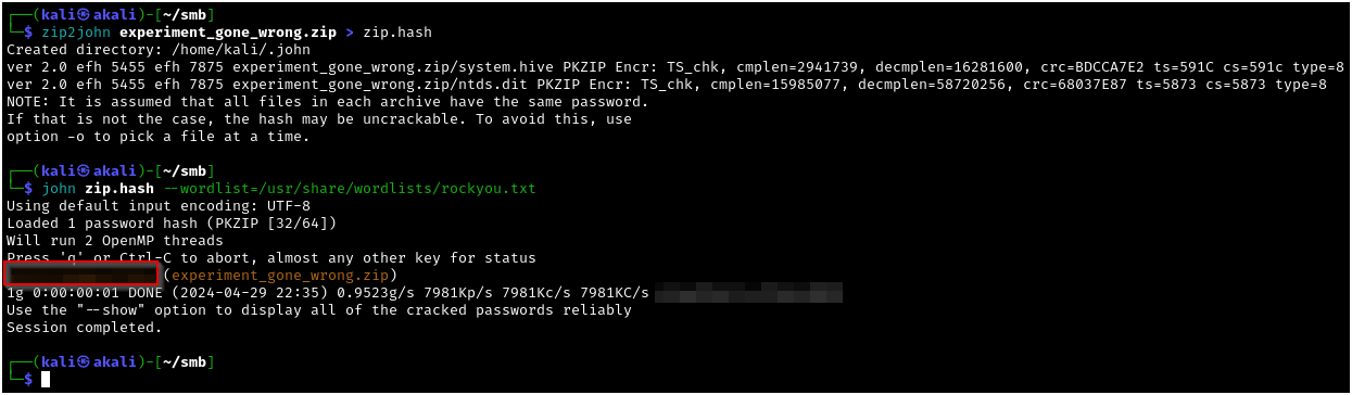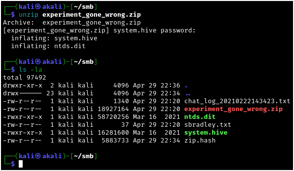 The chat logs also mentioned that sbradley has extracted the NTDS.dit and SYSTEM hive, and uploaded an encrypted version of NTDS.dit - the zip file that we saw in SMB. We will need to use zip2john and john to extract and crack the hash for the zip file, which is also one of our objectives:
