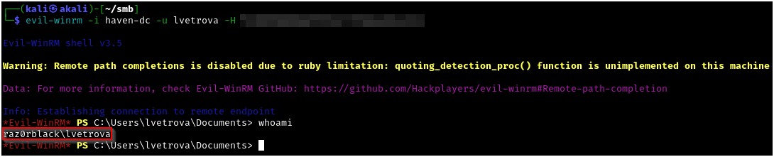 Using this hash, we can get a WinRM shell as the lvetrova user: