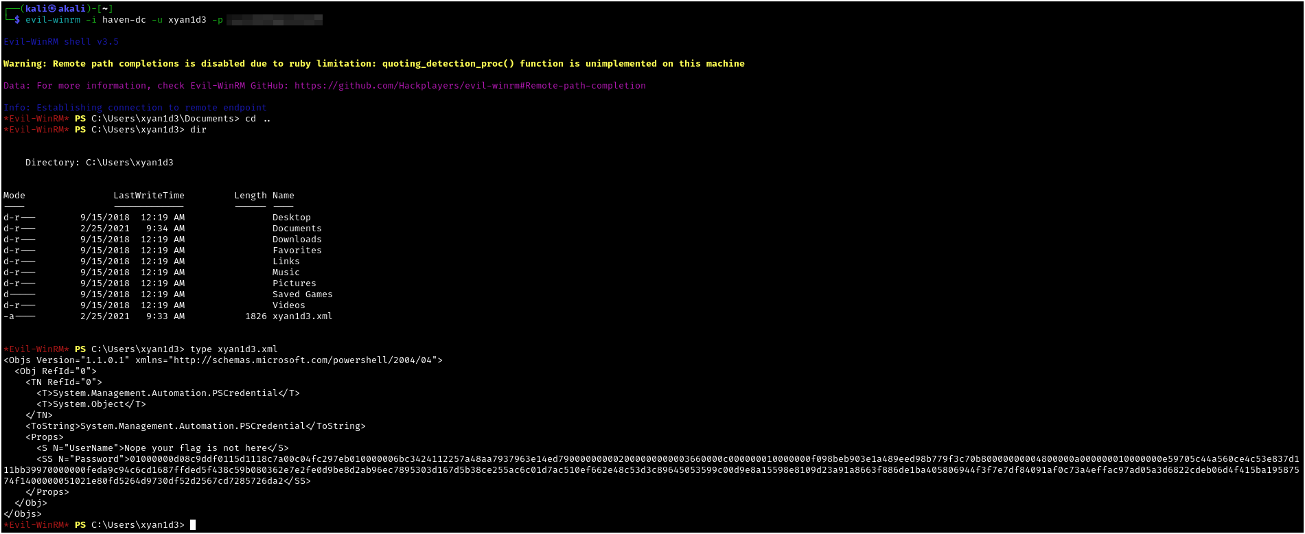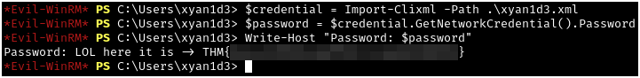 We can log back in with xyan1d3’s credentials to find a PSCredential XML file in the user’s directory.