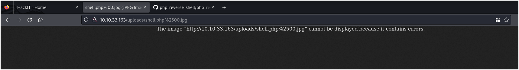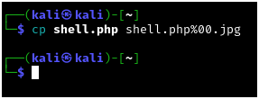 My next thought was to try to inject a null byte into the filename, which should in theory terminate the string and still run the PHP script, ignoring the .jpg extension that I’m adding to bypass the upload filter: