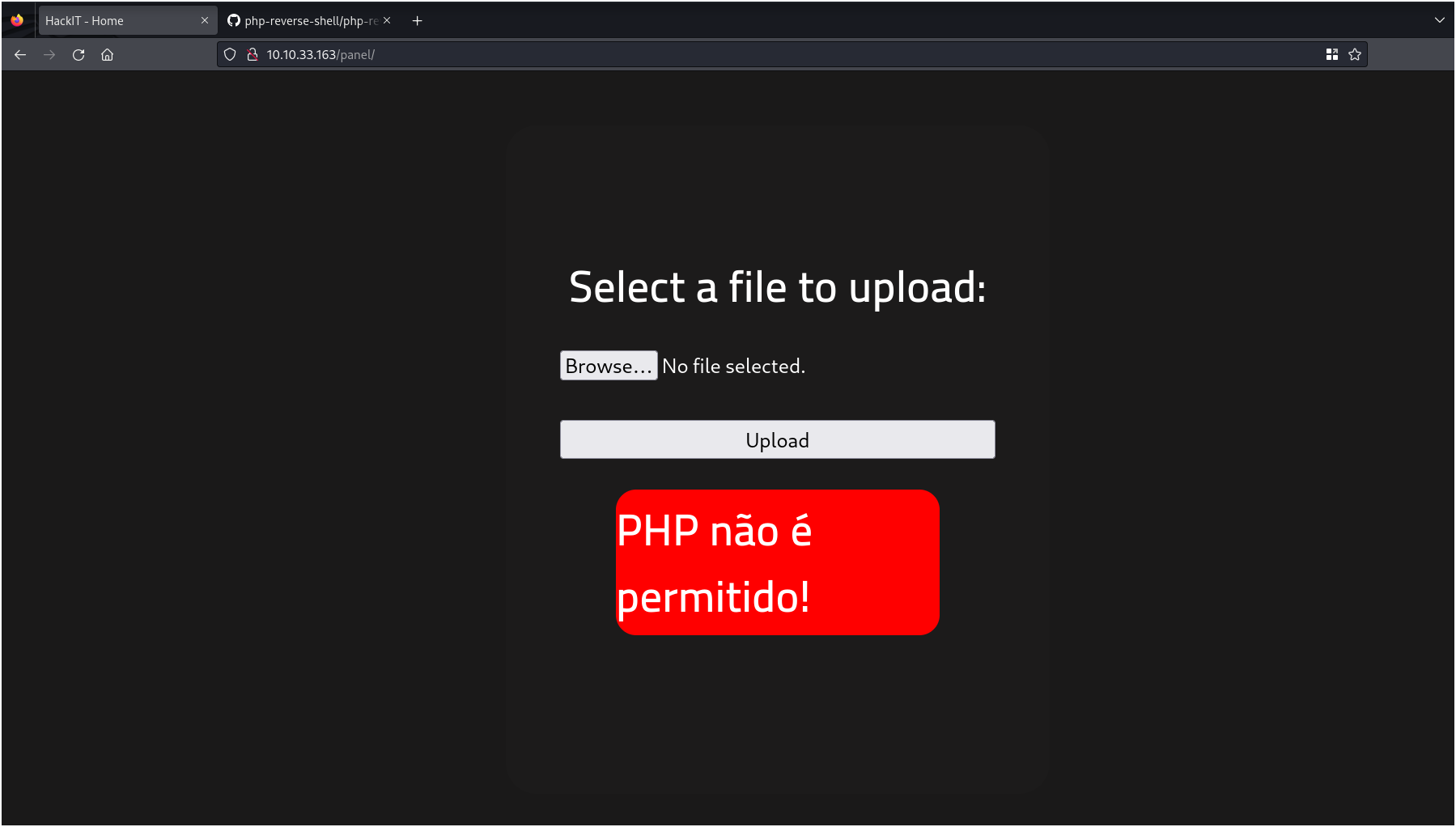 Since we know from our nmap scans that the web server is running Apache, we can assume that we will be able to run PHP scripts. As such, I modified the Pentest Monkey PHP Reverse Shell (https://github.com/pentestmonkey/php-reverse-shell/blob/master/php-reverse-shell.php) to connect to my VPN IP address over port 9001 (because “it’s over 9000!”) and uploaded the file as “shell.php.” As we can see, the shell is rejected, and we are given a message that PHP is not an allowed file type: