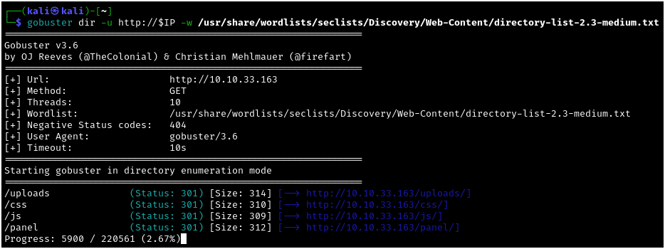 Next I ran gobuster in directory mode to see if I could find any interesting directories. Immediately I get /uploads, which is interesting, and right after that I can see /panel, which is interesting as well.