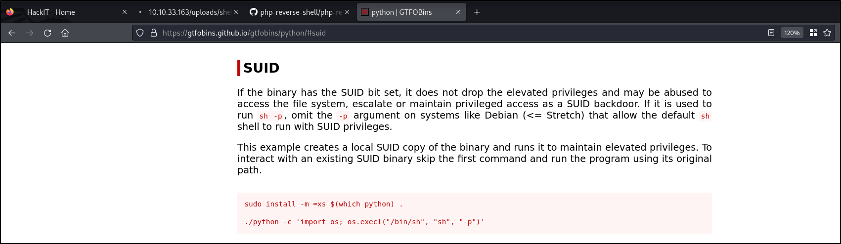 Using GTFOBins, I was able to source a command to escalate privileges exploiting the misconfigured SUID permissions for python: