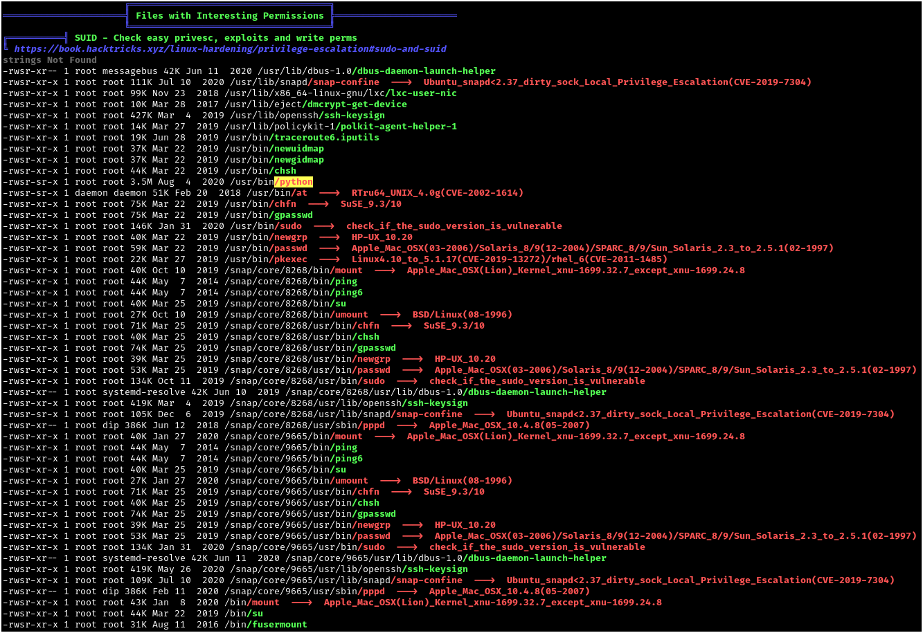 With the script staged, it was time to execute. Early in the runtime of the script, I was able to see the coveted yellow flag, indicating a near-guaranteed privesc vector. In this case, python has the SUID and SGID bits set: