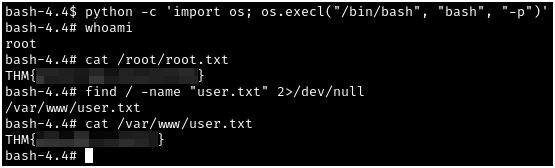 Using this command (slightly modified, because I wanted to use bash rather than sh) I was able to escalate to root. At this point I was able to prove compromise by reading the root.txt file, as well as the user.txt file that was in the web server directories.