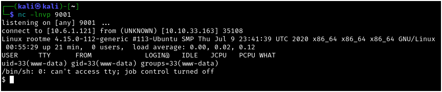 This time, the file is executed properly, and I am able to catch my reverse shell in the listener I set up prior to execution: