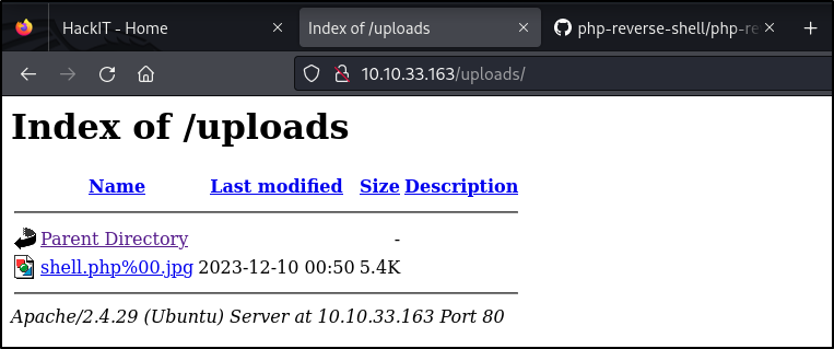 I can see the file that I’ve uploaded in the /uploads directory that we saw earlier in our gobuster scan, which means that this is where the files from the form are being stored: