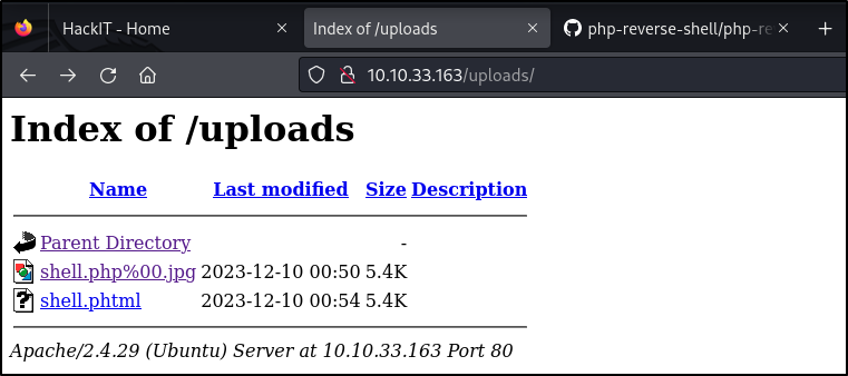 This file also succeeded in bypassing the upload filter, as we can see by viewing it in the uploads directory: