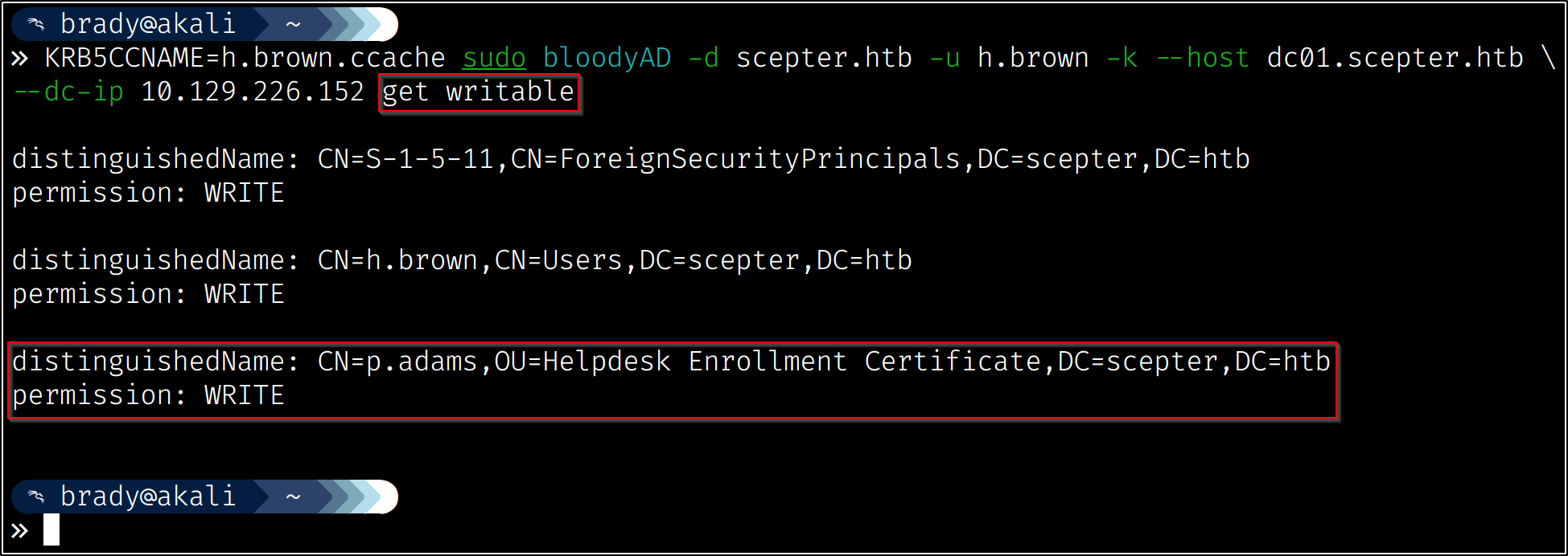 After we have grabbed our flag, we can use bloodyAD to check what we can write to, since we assume we can escalate privileges from the h.brown user: