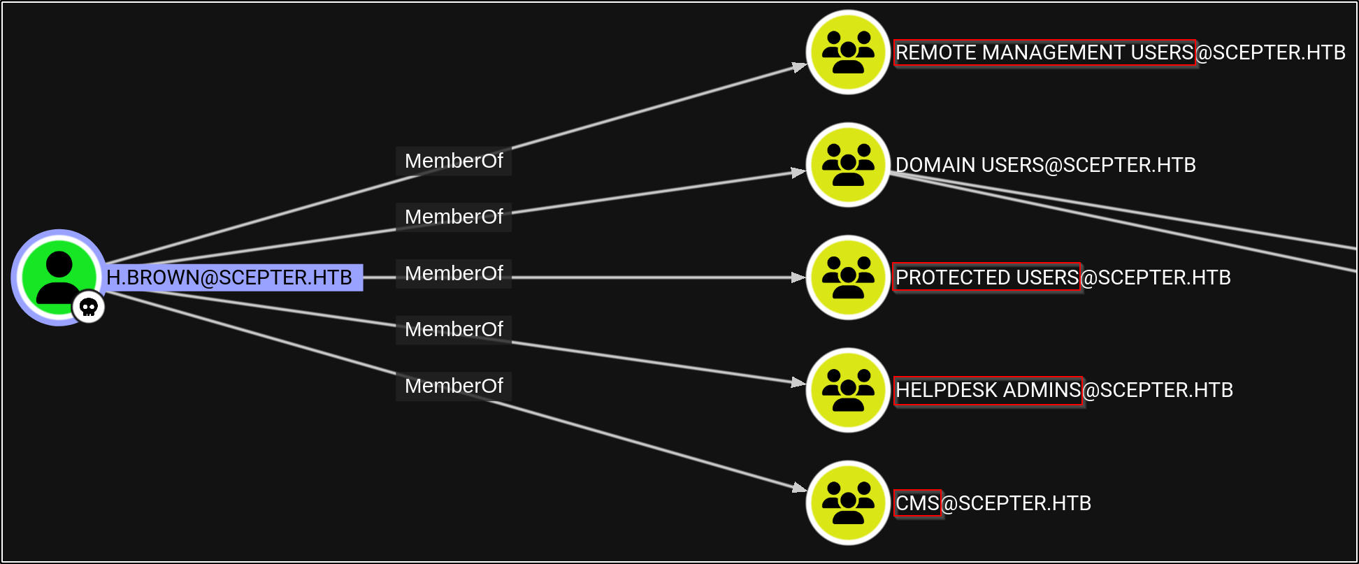 Using Bloodhound, we can see that h.brown is in a handful on interesting groups: