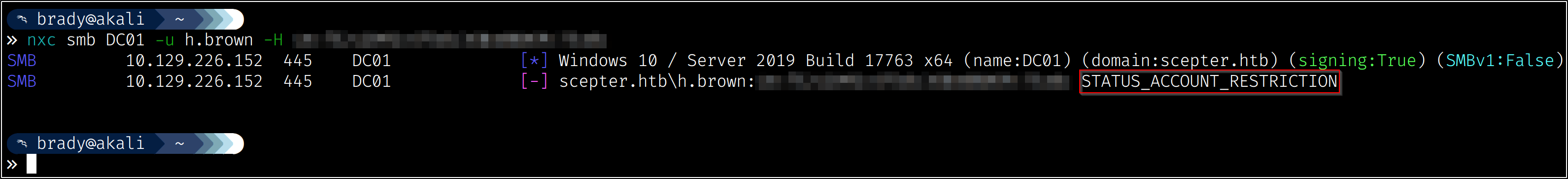 For example, because of membership in the “Protected Users” group, h.brown is denied NTLM authentication: