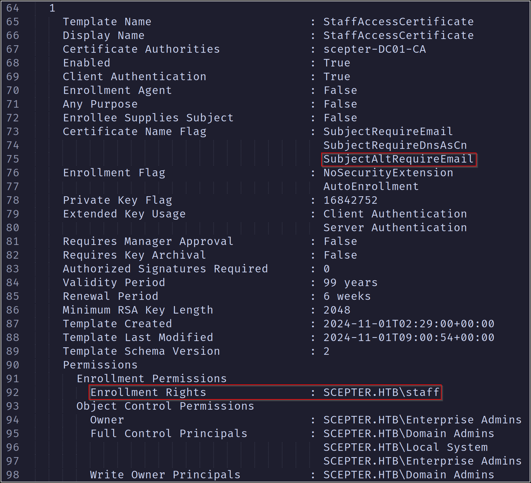 We can use certipy to enumerate certificate templates that will work for our privilege escalation attempt(s). We can see that the “StaffAccessCertificate” template allows for both client and server authentication, and the “Staff” group can enroll. Note also that the SubjectAltRequireEmail flag is set, indicating that to enroll, a principal will need to have its mail attribute set: