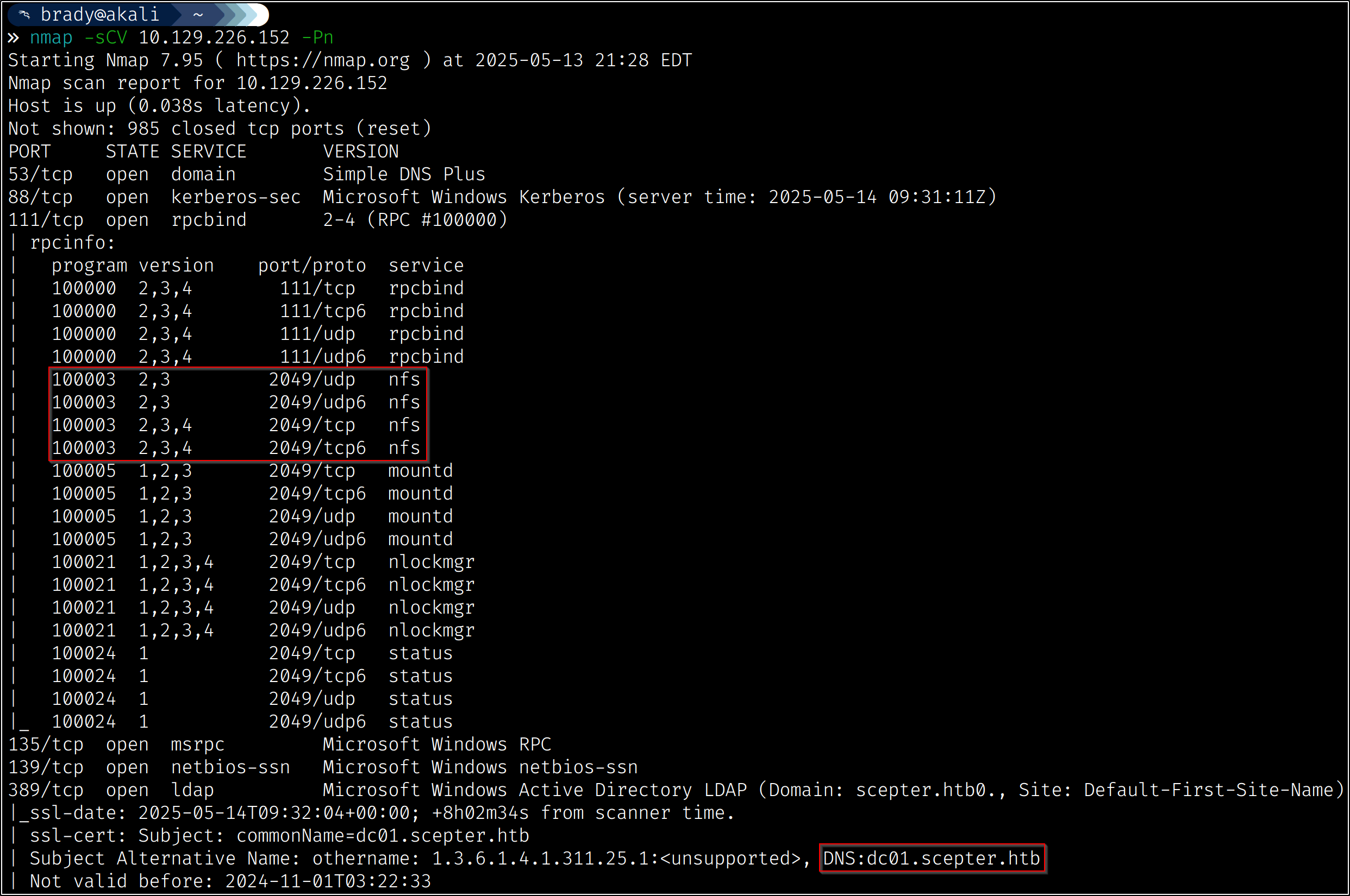 The two important things we can note from the output (other than services that suggest we are looking at a domain controller) are the suggestion of NFS shares and the DNS hostname, which we can add to our /etc/hosts file: