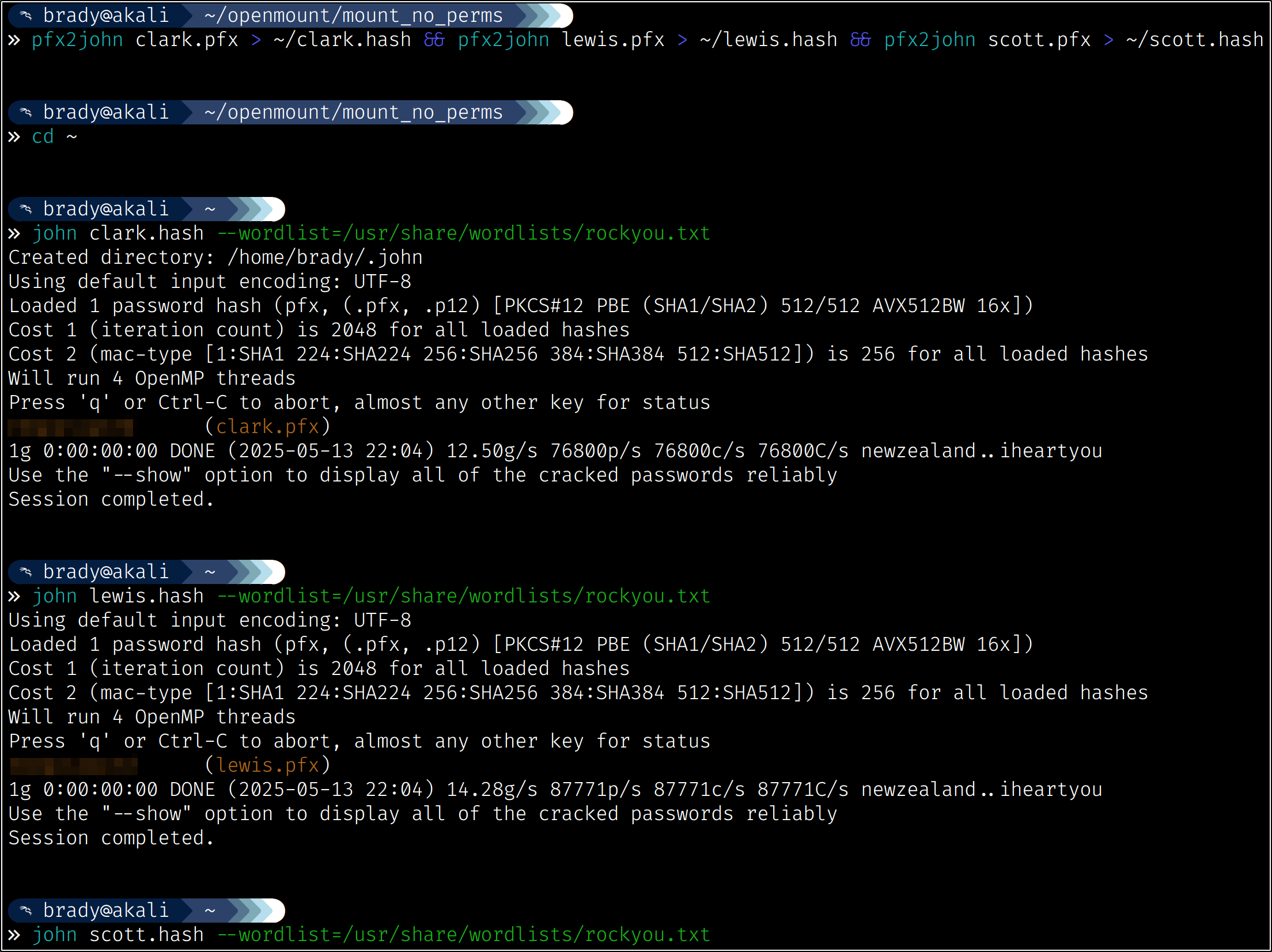 We can use pfx2john to extract the password hashes from these files in a format that john can crack, which results in the same password for all three files: