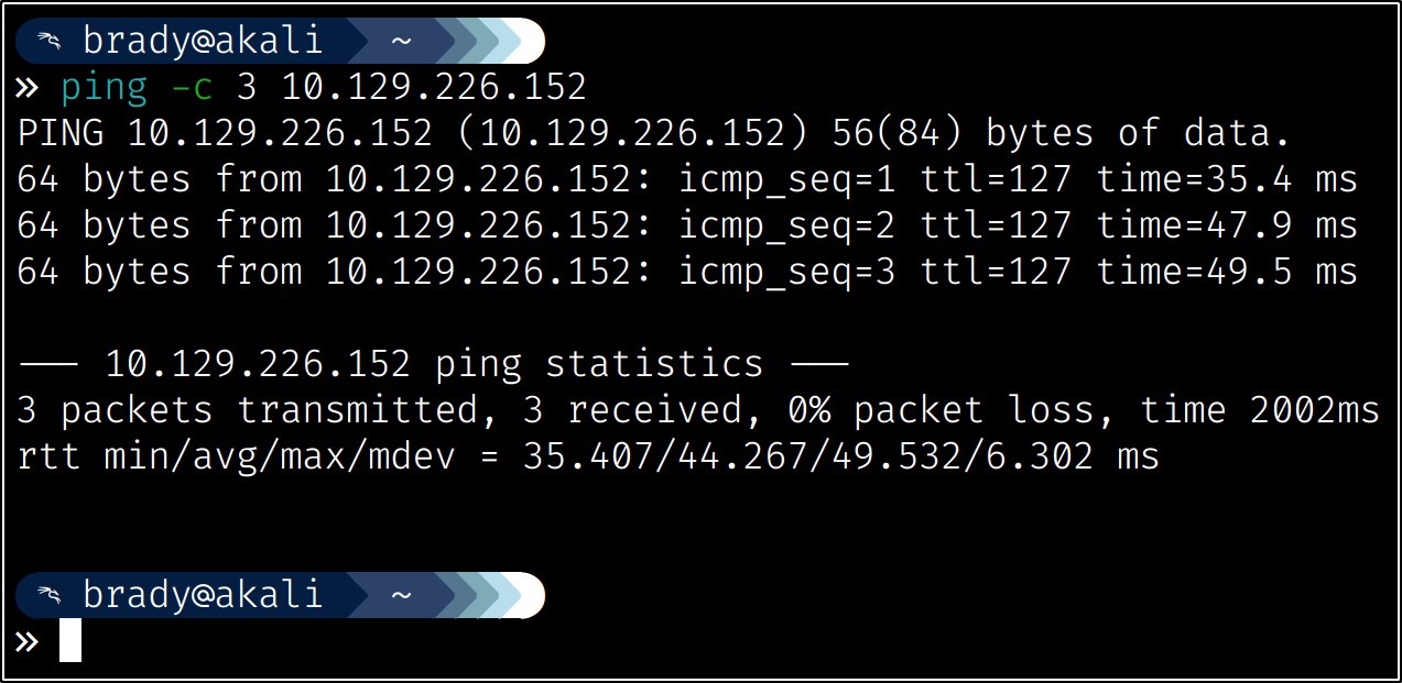 My first step was to confirm connectivity to the victim IP address.