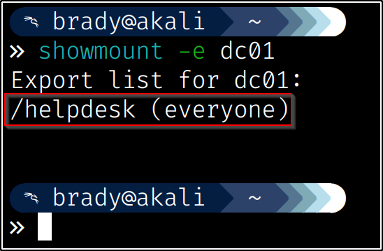 We can use showmount -e to see which shares are exported on the domain controller: