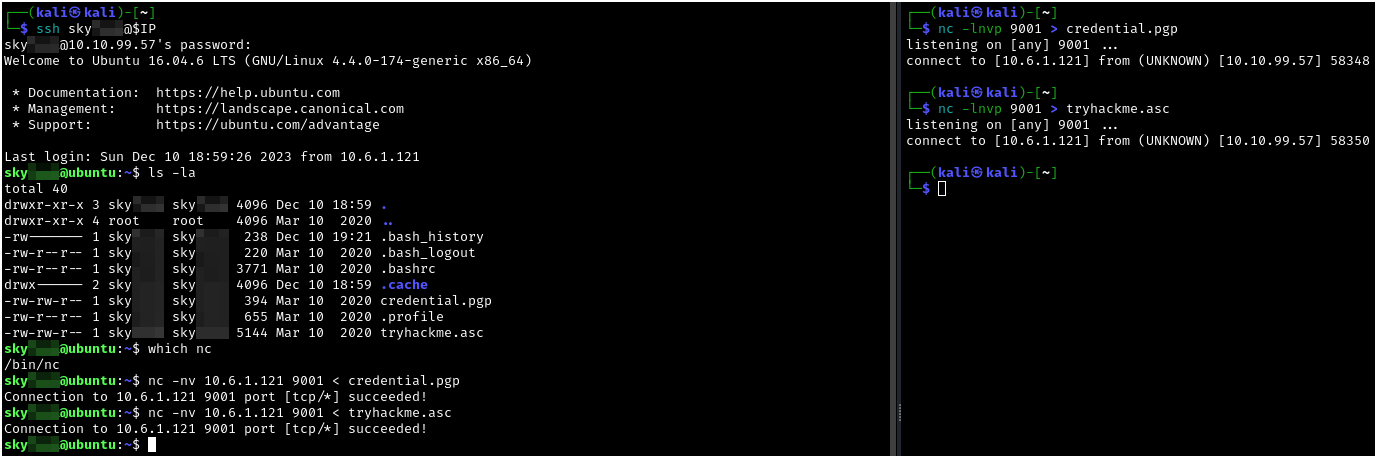 After finding that Sky is unable to use sudo on this machine, I decided to look around in the home directory to see if could find anything interesting. In this case, two files jumped out at me - a credential.pgp file that might hold some credentials, and the corresponding ASCII file in tryhackme.asc. I moved these two files to my attacking host using nc so that we could proceed to decrypt the file offline: