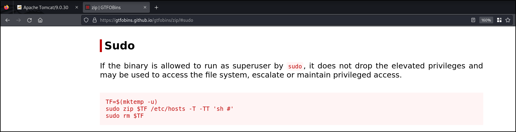 Referencing GTFOBins, we can see that there is a well-known exploit for escalating to root using zip: