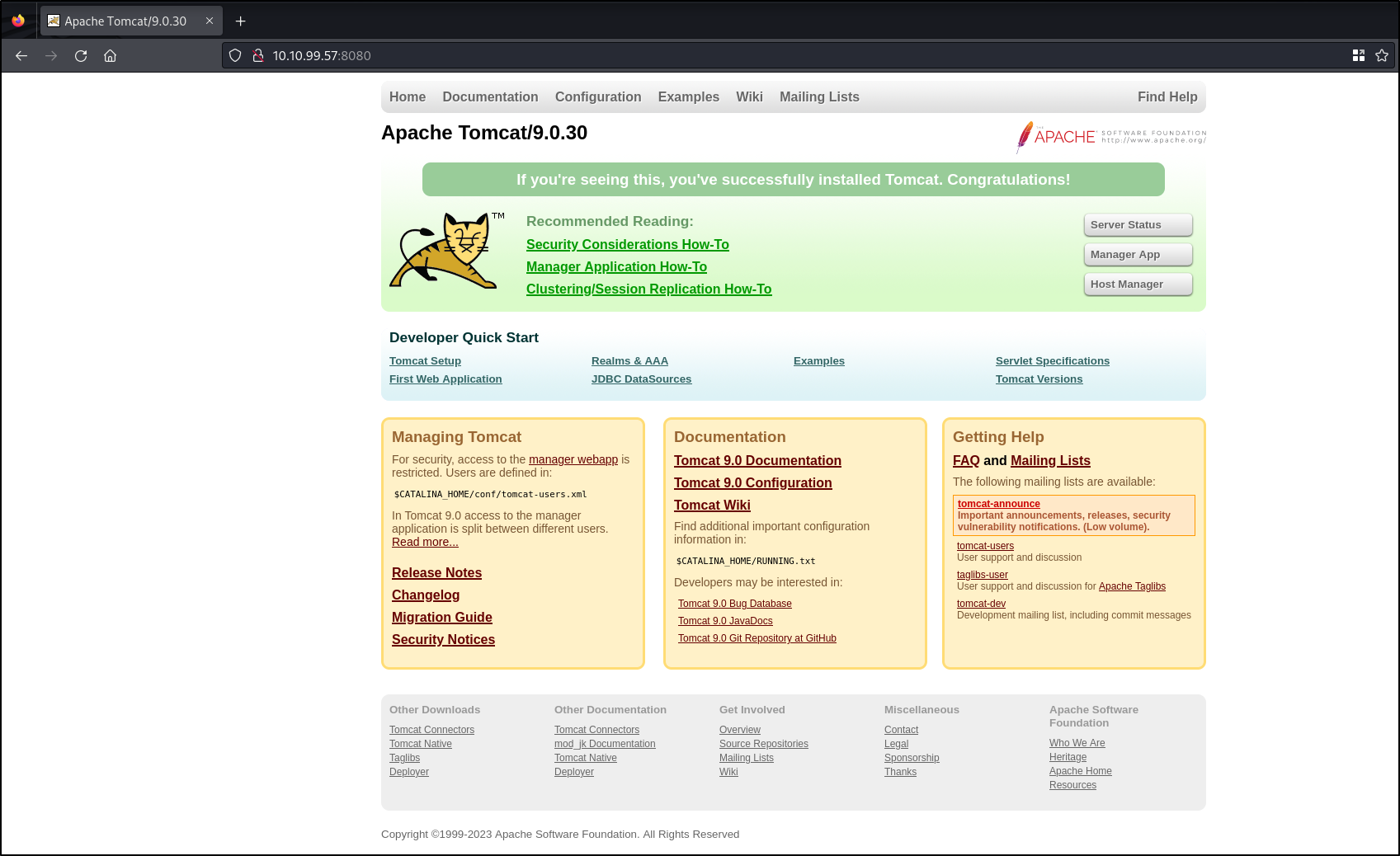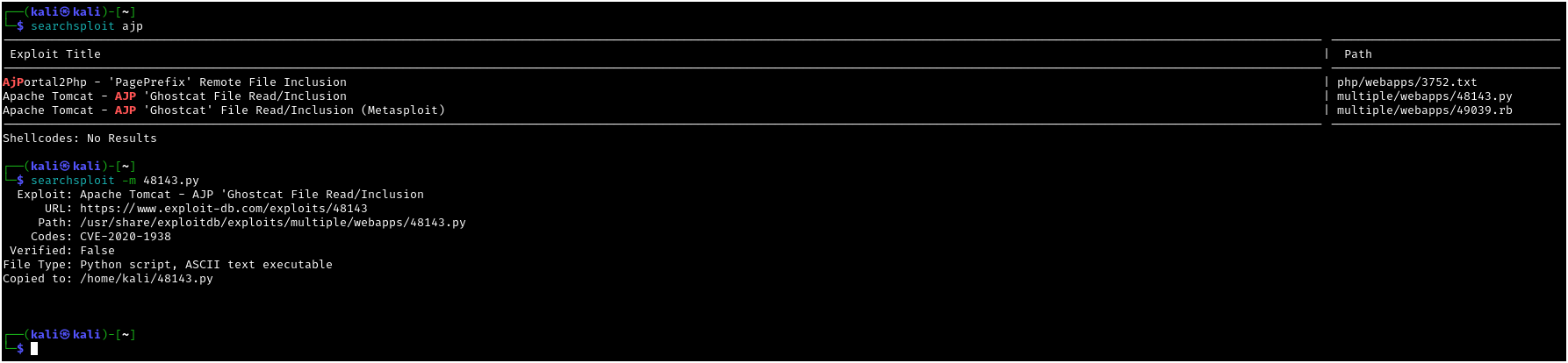This just looks like a default page for Apache Tomcat, which should be cleaned up but is not actionable right now. Next, I’ll use searchsploit to see if there are any published exploits for the “AJP” service we saw on port 8009: