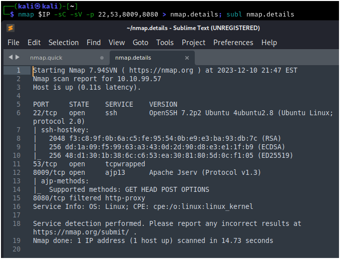 After that I wanted to further enumerate the service versions and run some basic nmap scripts against these ports: