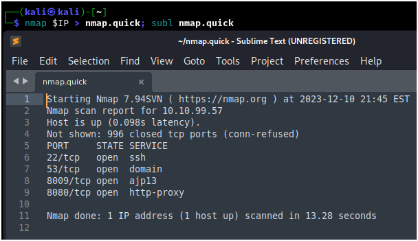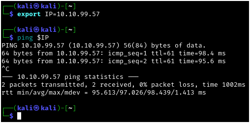 My first step was to export the box’s IP address to a variable that I could use easily for the rest of the engagement. Next I pinged the box to ensure that it was alive and ready for enumeration.