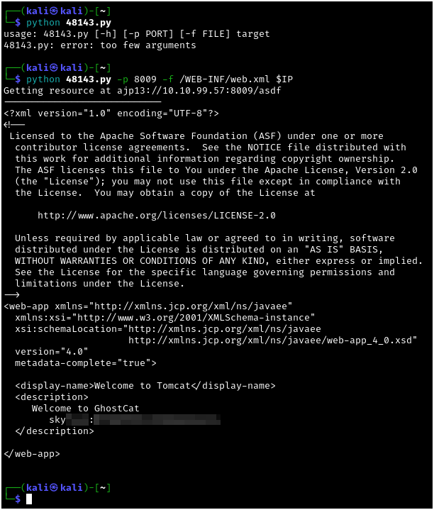 For demonstration purposes, we could also run the python exploit that we grabbed from searchsploit earlier. In this situation, we would assume that we researched the exploit and now know that Apache Tomcat can sometimes store sensitive information within /WEB-INF/web.xml, and we can use the python script that we copied over to find the usage for the script as seen: